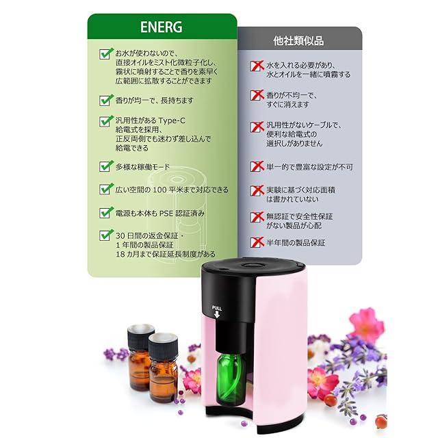 ENERG e's Explorer アロマディフューザー ネブライザー式 TYPE-C 給電式 2025 ヨガ室 ホテル 店舗 人気 タイマー機能 ノズルアダプタ2個 空瓶3個・スポイト1個付き T11-ENS1 ライトピンク
