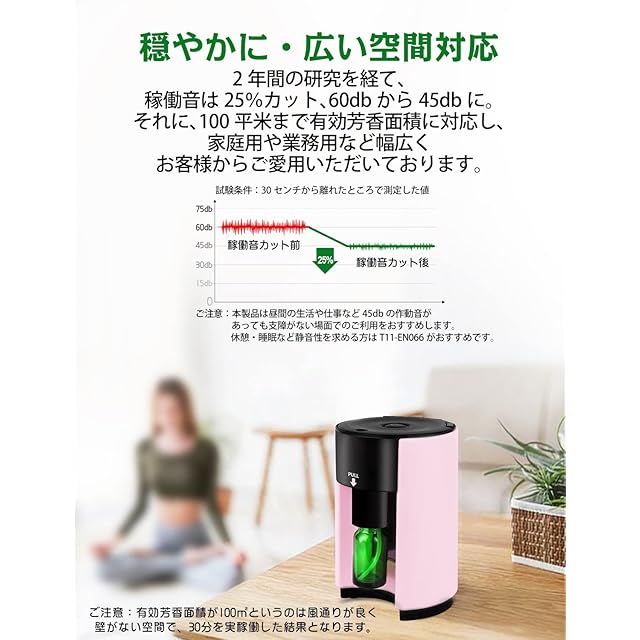 【手入れ楽々・稼動音低減デザイン】メンテナンス時、5mlのエタノールに精油瓶に入れ、本体にセットし、スイッチを押すだけで残った香りがすぐ揮発し綺麗になります。また、内部システムは低騒音稼働に設計し、お仕事、休憩、運動、睡眠の時など、最大限度にお邪魔されないように、ポンプの周りに防音材、内部の騒音発生しやすい部品接着部に防音材を採用しております。(完全な静音タイプではないので、音に敏感な方は弊社の送風式タイプのご購入はお勧めいたします。)