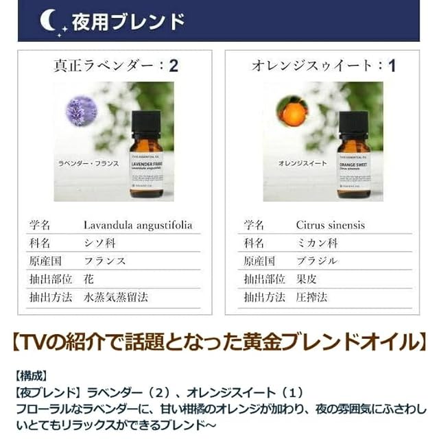 【使用方法】ラベンダーとオレンジのリラックスブレンドです。ディフューザーやアロマランプ、アロマストーン、アロマ加湿器で芳香浴をお楽しみください。万人受けする香りのため、ご家族が集まるリビングや公共の場での芳香にも向いています。また、就寝前のリラックスタイムに適しており、優しく落ち着いた香りが心地良い眠りを誘います。