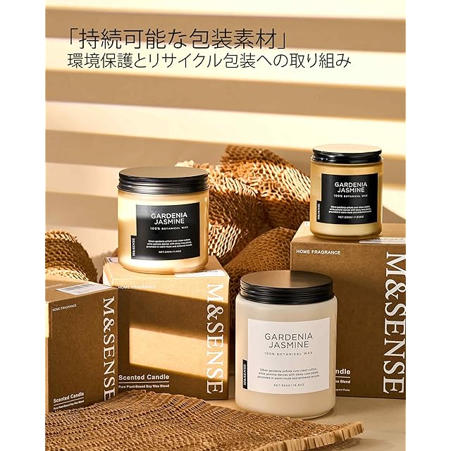 「持続可能な処方 」- M&SENSE のキャンドルはすべて、最高級で最も自然な成分で作られています。米国産の大豆と植物性ワックスを高級ブレンドし、二重の無漂白綿芯を使用し、リユーザブルかつリサイクル可能なガラス瓶に入れています。持続可能な未来のため、リサイクル紙の箱で包装されています。