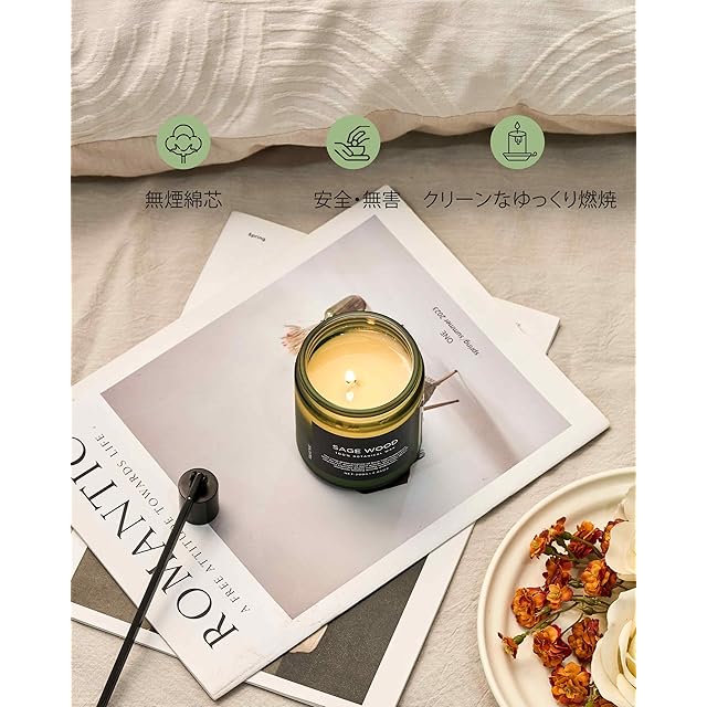 【高品質ソイワックス】:M&SENSE キャンドルは、最高品質の原料から作られています。アメリカ産のソイワックスと植物ワックスの高級ブレンドを使用し、未漂白の二重芯を使用しており、再利用可能でリサイクル可能なガラス瓶に入っています。より持続可能な未来のためにリサイクルされた段ボール箱で梱包されています