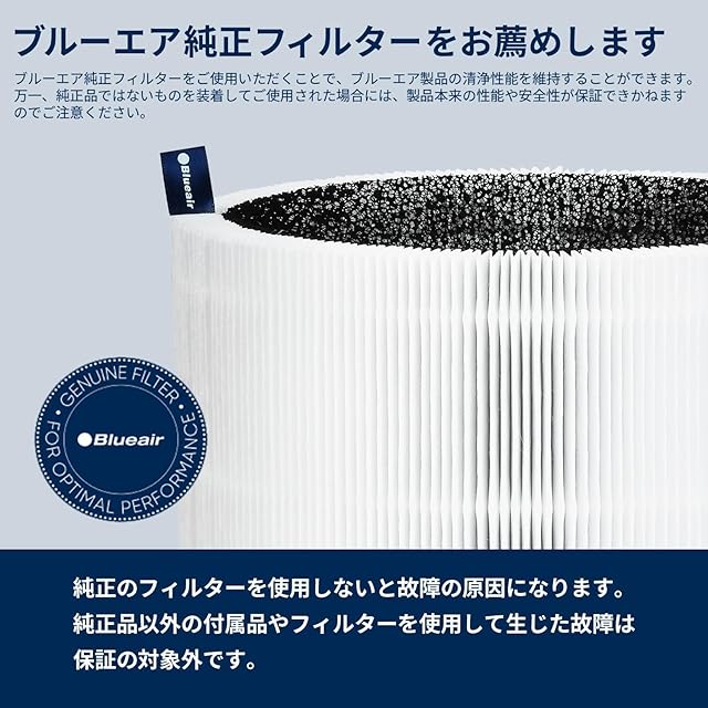【ブルーエア純正フィルターをおすすめします】ブルーエア純正フィルターをご使用いただくことで、ブルーエア製品の清浄性能を維持することができます。万一、純正品ではないものを装着してご使用された場合には、製品本来の性能や安全性ができかねますのでご注意ください。また、純正品以外のフィルターや付属品を使用して生じた故障は、の対象外となります。