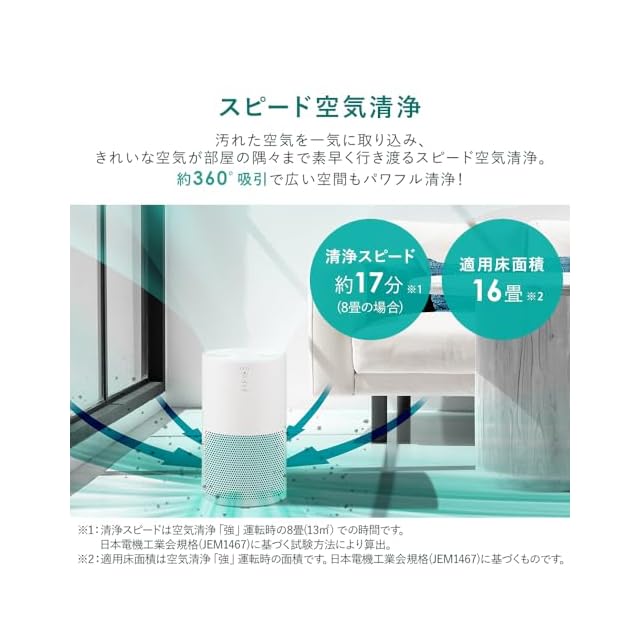 汚れた空気を一気に取り込み、キレイな空気が部屋の隅々まで素早く行き渡るスピード空気清浄。