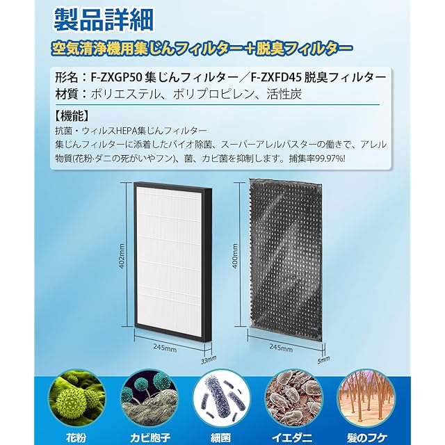 【パッケージ内容】 F-ZXGP50 集じんフィルター ×1、 F-ZXFD45 脱臭フィルター ×1、日本語取扱説明書×1