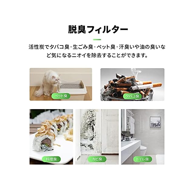 【製品機能】PM2.5/スモッグ等の除去;集じん機能:花粉やアレル物質(ダニのフン・死骸)、ウイルス、カビ菌/ホコリ チリ、タバコの煙(粒子)、ペットの毛、タバコのにおい、トイレのにおい、生ゴミのにおい、ペットのにおいなどを捕集できます;脱臭機能:料理臭、ペット臭、部屋干し衣類の生乾き臭、加齢臭などを消臭できます。タバコの煙(ニオイ)、トイ レのニオイ、生ゴミの ニオイ、ペットのニオイ などの生活臭を吸着・分解します。