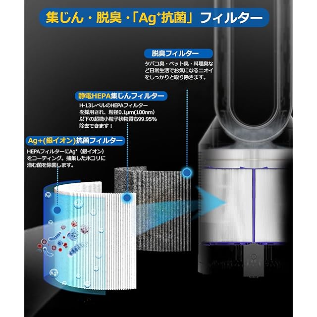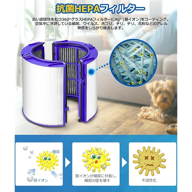 【銀イオン除菌フィルターとして】HEPAフィルターにAg+(銀イオン)をコーティング!捕集したホコリに潜む菌を除菌します。フィルターの相性もピッタリし、一方、フィルターに銀イオンをコーティングすることでフィルターに付着した細菌の繁殖を抑制します。細菌から赤ちゃんやお年寄りをしっかりガードします。コスパ最高!