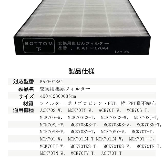 【交換品】空気清浄機交換用フィルター 集じんフィルター 互換品(非純正) 、対応型番:KAFP078A4(1枚入)。