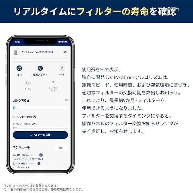 【リアルタイムにフィルターの寿命を確認*】使用残を%で表示。独自に開発したRealTrackアルゴリズムは、運転スピード、使用時間、および空気環境に基づき、適切なフィルターの交換時期を算出しお知らせ。これにより、最長約9か月(1日24時間使用の場合の目安。使用環境に異なる)フィルターを使用できるようになりました。フィルターを交換するタイミングになると、操作パネルのフィルター交換お知らせランプが赤く点灯し、お知らせします。*Blue Max 3250は対象外。
