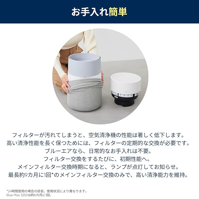 【お手入れ簡単】フィルターが汚れてしまうと、空気清浄機の性能は著しく低下します。高い清浄性能を長く保つためには、フィルターの定期的な交換が必要です。ブルーエアなら、日常的なお手入れは不要。フィルター交換をするたびに、初期性能へ。