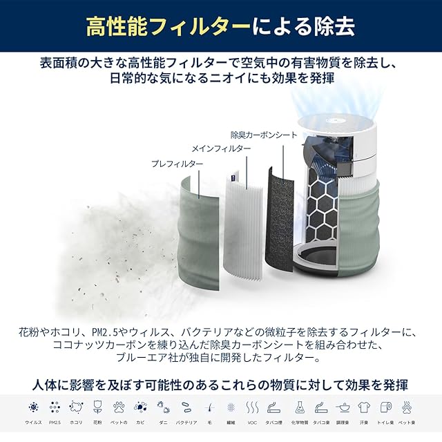 【表面積の大きな高性能フィルターで空気中の有害物質を除去し、日常的な気になるニオイにも効果を発揮】花粉やホコリ、PM2.5やウィルス、バクテリアなどの微粒子を除去するフィルターに、ココナッツカーボンを練り込んだ除臭カーボンシートを組み合わせた、ブルーエア社が独自に開発したフィルター。