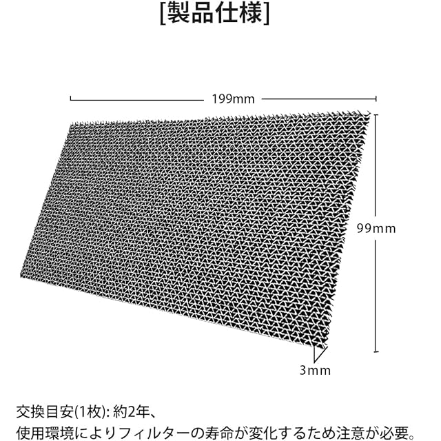 【製品仕様】外寸(mm): 横199×縦99×厚5。注記: 1.水洗いしないでください。2.抗ウイルスフィルターと集塵・脱臭フィルターは、併用できません。