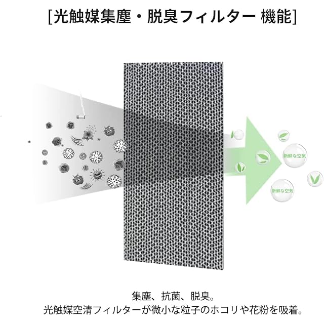【製品機能】PM2.5/スモッグ等の除去;集じん機能:花粉やアレル物質(ダニのフン・死骸)、ウイルス、カビ菌/ホコリ チリ、タバコの煙(粒子)、ペットの毛、タバコのにおい、トイレのにおい、生ゴミのにおい、ペットのにおいなどを捕集できます;脱臭機能:料理臭、ペット臭、部屋干し衣類の生乾き臭、加齢臭などを消臭できます。タバコの煙(ニオイ)、トイ レのニオイ、生ゴミの ニオイ、ペットのニオイ などの生活臭を吸着・分解します。