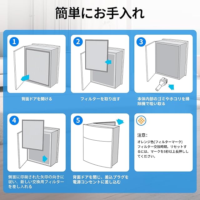 交換目安:約6カ月(24時間使用の場合)。フィルターが汚れると空気清浄機の性能は著しく低下します。高性能を維持するためにフィルター交換が簡単であることがもっとも重要です。