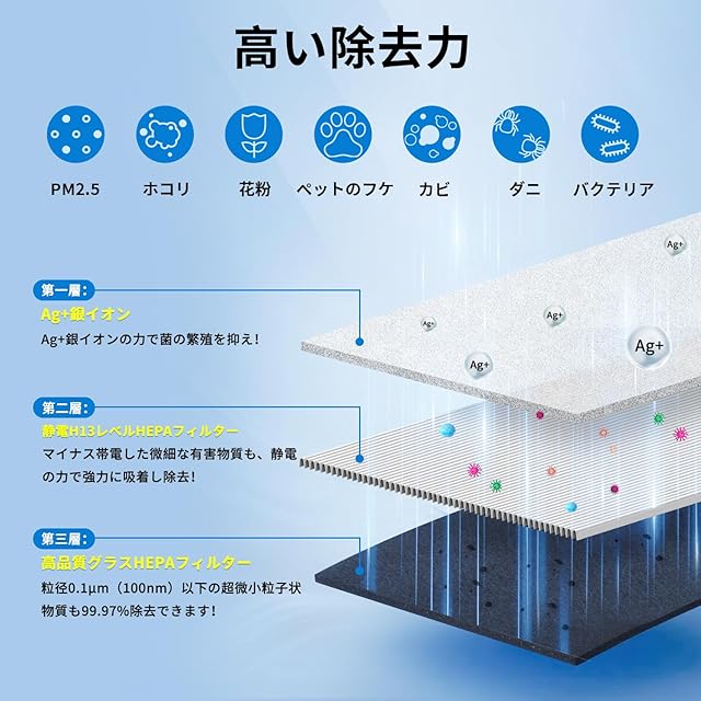 高性能:紙パックは4層のアレルギーブロック素材から作られており、花粉、ウィルス、細菌、カビ、アレル物質などの0.1ミクロンというナノレベルの粒子を99.97%除去に加えて、お気になるニオイやマイクロプラスチックなどの有害物質もハイスピードで清浄することができます。