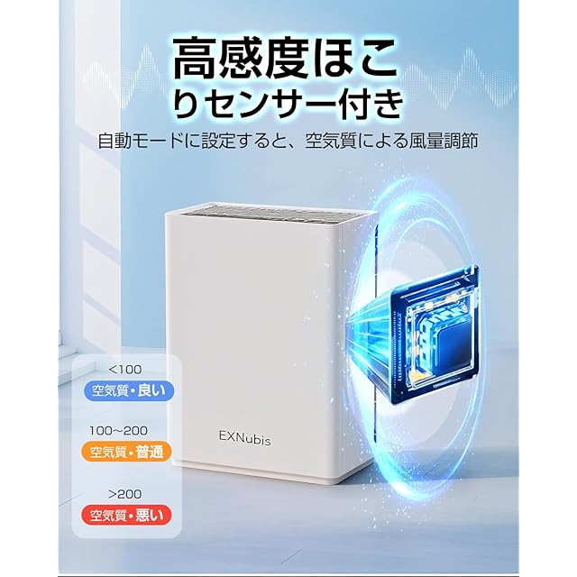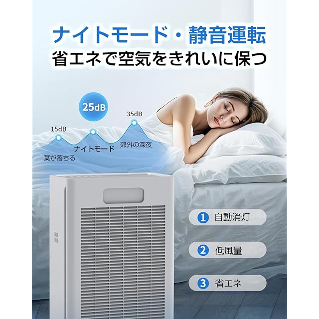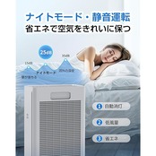 【静音・睡眠モード】 省エネと超低騒音モーターを使用しており、消費電力僅か35Wです。運転音は25dB以下に抑えられ、睡眠、勉強、仕事の時でも気になることがありません。睡眠モードを設定すると、より静かな運転で眠りを妨げることなく、一晩中空気を清浄に保ちます。また、パネルのライトは睡眠モード設定から自動消灯、無駄な電力消耗がなく、音や光が睡眠を邪魔することはありません。