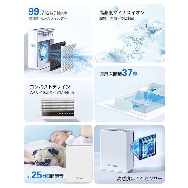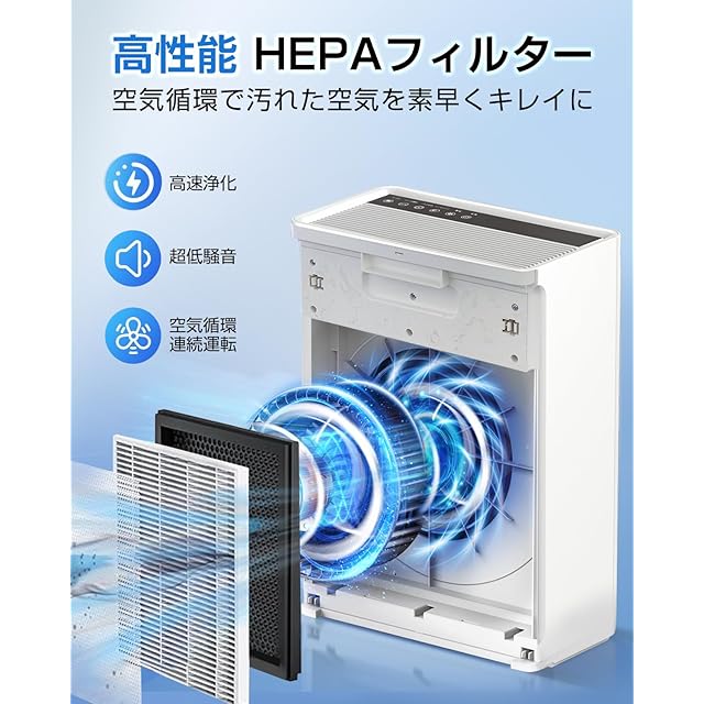 【高品質HEPAフィルター搭載】 内蔵された高品質のフィルターは、ホコリや抜け毛を捕らえる集塵フィルター、細かい浮遊物質を捕集するHEPAフィルター、活性炭脱臭フィルターという構造により、空気中の汚れやニオイをしっかりと吸い込みます。花粉、ホコリ、ハウスダスト、PM2.5などの空気汚染物質、タバコの臭い、ペットの臭いや抜け毛など様々な問題をこの一台で解決し、鼻詰まりやくしゃみなどのアレルギー症状を和らげることができます。