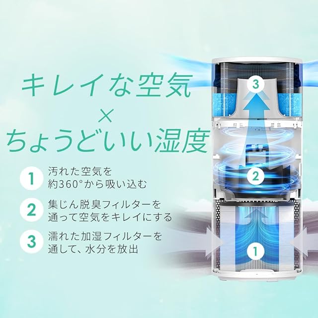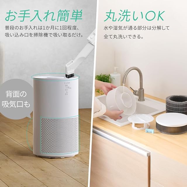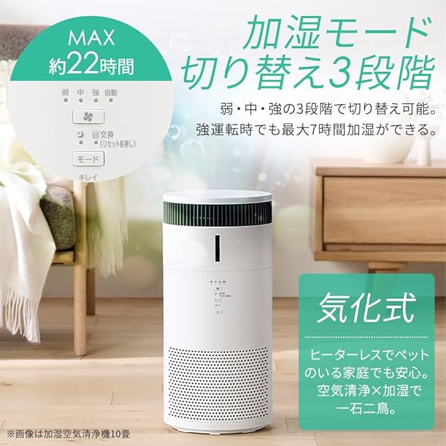[気化式]ヒーターレスでペットのいる家庭でも安心。空気清浄×加湿で一石二鳥。[上から給水]加湿ユニットを外さなくても、フタを外し上から水を注ぐだけでOK。シンクでの給水も楽々できる。