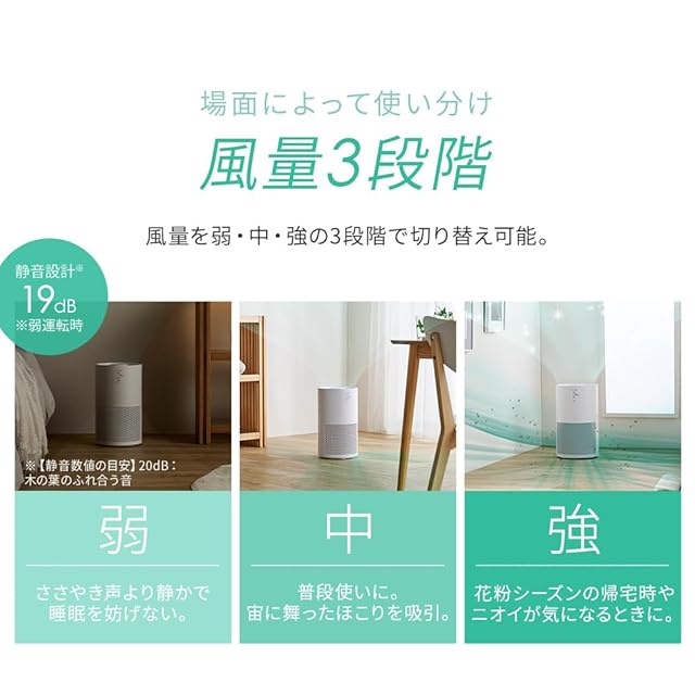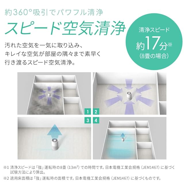 汚れた空気を一気に取り込み、キレイな空気が部屋の隅々まで素早く行き渡るスピード空気清浄。