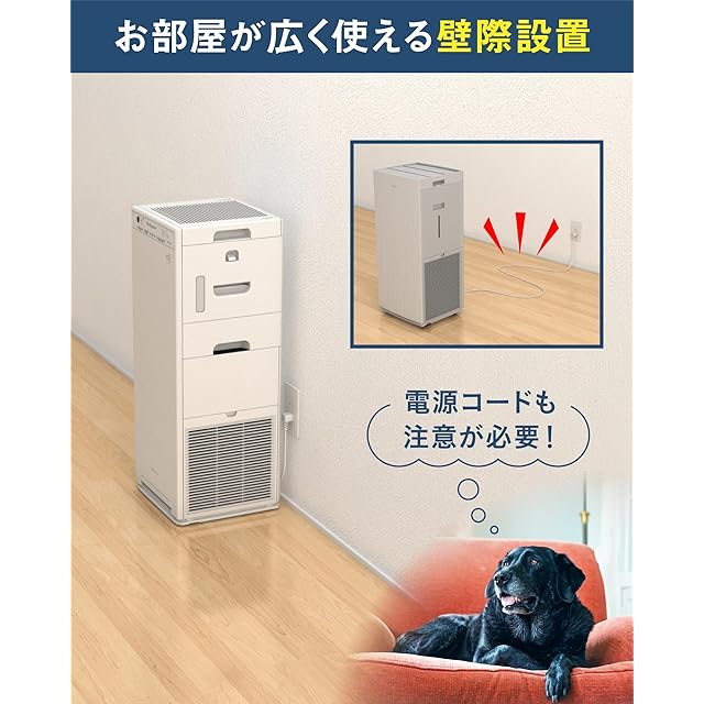 静音性に配慮したタワー型。左右+前方の3方向から吸い込み。壁際に設置出来る