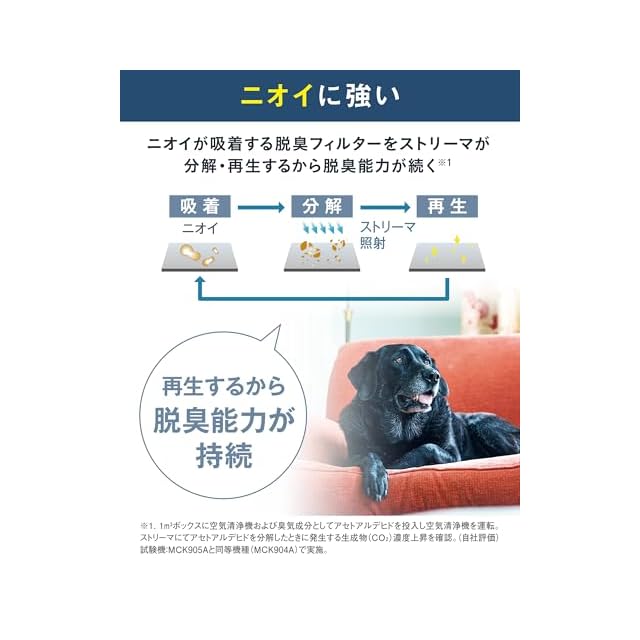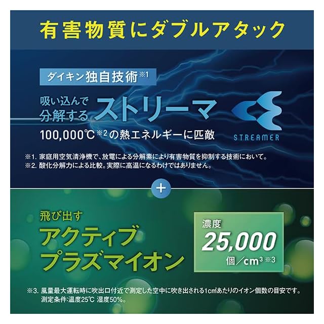 ストリーマとアクティブプラズマイオンのダブル方式で空気をキレイに。花粉、ウイルス、ニオイ、ハウスダストに強い。