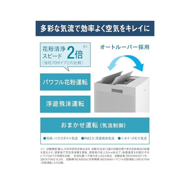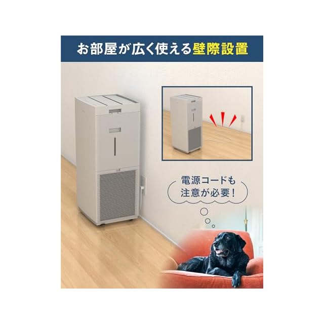 加湿機能付き大風量空気清浄機。広いリビング対応。省スペースで設置(設置面積はA3用紙以下)