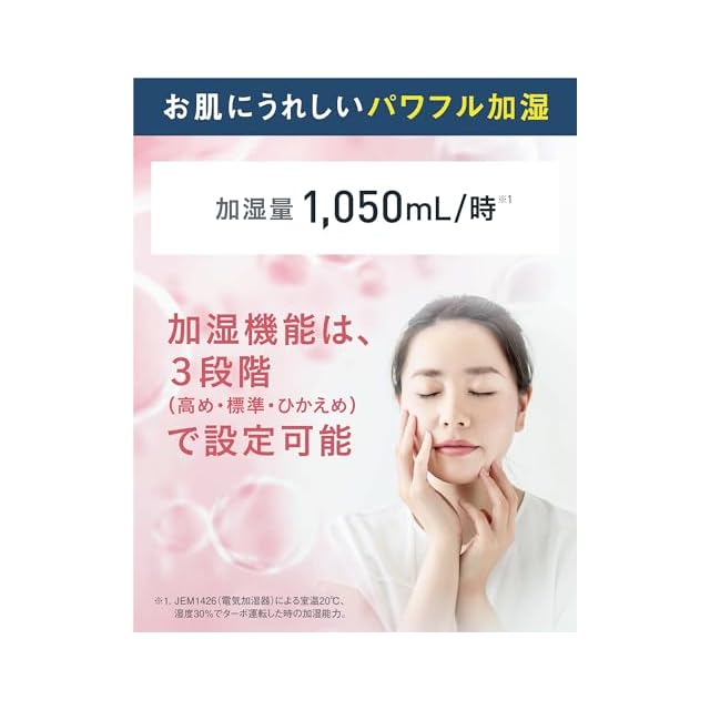 たっぷりの加湿量 1,050ml/時。加湿する水も本体内部もトリプル対策で清潔に保つ。(ツインストリーマ、抗菌加湿フィルター、水トレーに銀イオン剤)