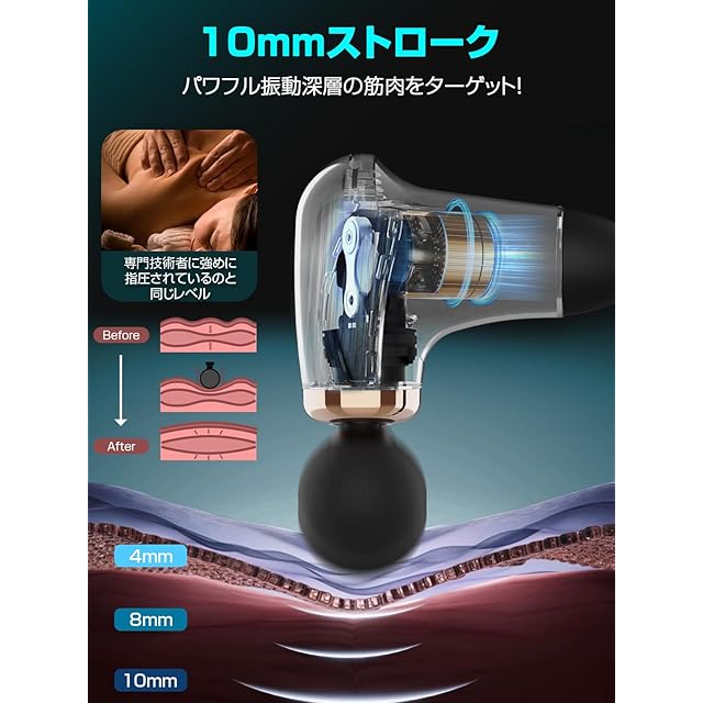 【史上最高ハンディガン!強く、深く、届く振動】一般的な筋膜リリースガンの振幅は約6mmで、主に表面的な筋膜にしか影響を与えません。しかし、Zruimの筋膜リリースガンは10mmの深い振幅を持ち、深部の筋膜にまで届く強力な振動を実現します。これにより、緊張や硬直を内側から解放し、全身に深いリラクゼーションをもたらします毎分3300回の振動が約10mm深く筋膜に浸透し、問題の根本に直接アプローチ。Zruimハンディガンは、各方面のプロに愛用されており、従来のモデルと比較して、電動機の効率が300%向上し、安定した安全性を提供します。使用可能な年数も最大10年に達します。10mmの深い振幅で、通常の約2.5倍の力を発揮し、筋膜の深層にまで届いて心地よい刺激を与えます。深く、強く、効率的に振動し、内側から外側へ緊張と硬直を解放。全身を包み込むような深いリラックス効果を実現します。しっかりとした振動で、効率的に全身をケアします。