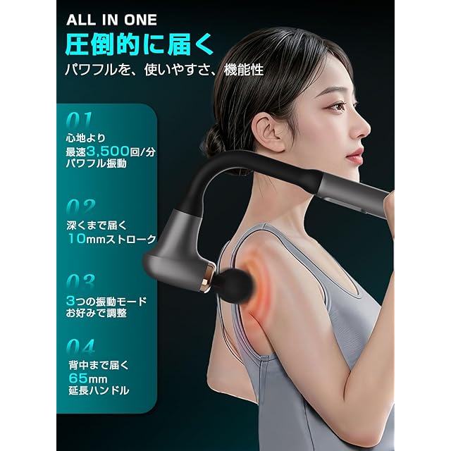 【1台で全身ケア、背中にも届く・弾力性アーム実用性】弊社の筋膜リリースガンは、特許設計を採用し、従来の製品に比べてさらに使いやすく進化しています。本体部分は適切に延長され、流線型のアーチを採用することで、使い心地がより柔らかく、手触りも優れています。伸縮性があり、異なる体格や年齢層の方々にも最適なフィット感を提供します。延長ハンドルは人間工学に基づいた設計が施されており、手にしっかりとフィットし、長時間使用しても疲れにくく、力を節約できます。このデザインにより、脚をケアする際には腰を曲げることなく、自然な姿勢で効率的に使用できます。背中をリフレッシュする際には、無理に手を伸ばすことなく、簡単に手が届き、死角も避けられるため、全身のどこでもリラックス効果を実感することができます。使い心地に配慮したデザインは、どの部位でも効率的に筋膜をリリースし、リラックスを促進。