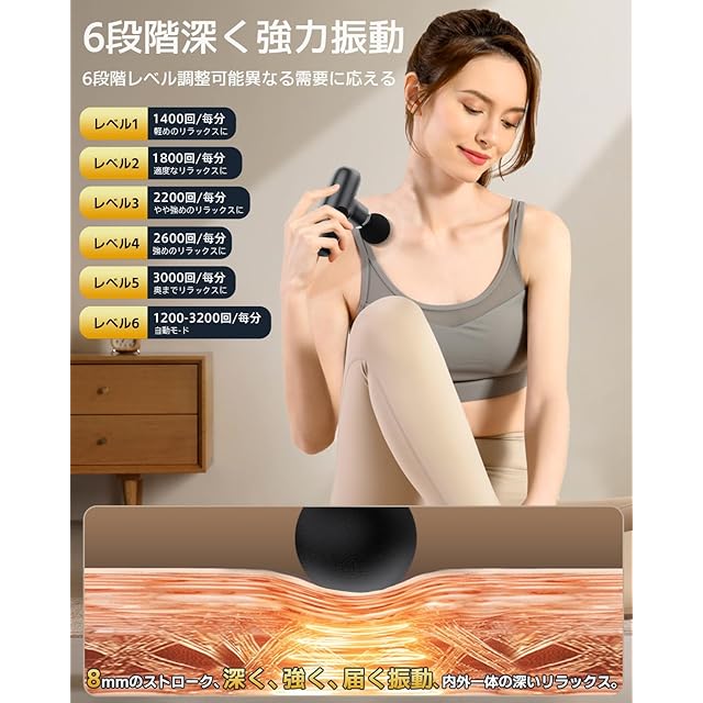 【深くまで届く!違いを生み出す8mmの振幅】振幅が深いほど、リリースガンはより深く、広範な範囲の筋肉に作用します。伝統的なミニ筋膜リリースガンはわずか6mmの振幅しかなく、表層の筋肉にしか影響を与えませんが、Lihilis(リヒリス)の小型筋膜リリースガンは振幅が8mmに達しており、深く、強く、届く振動、内側から外側に向けて緊張と硬直感を解放し、内外一体の深いリラックスをもたらします。しっかり振動!もっと全身に、もっと効率よく。