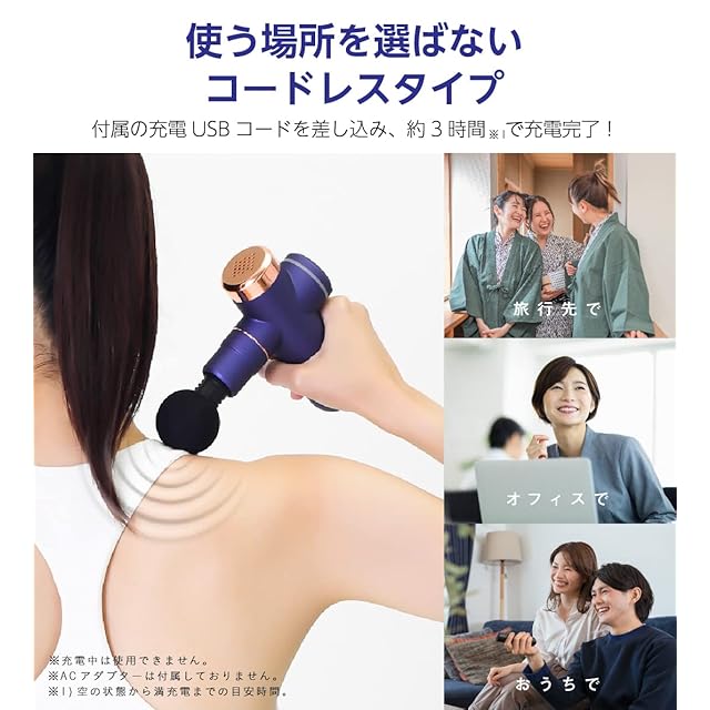 【便利なコードレスタイプ】いつでもどこでも場所を選ばず使えるコードレスタイプ。付属のUSBコードを差し込み約3時間で充電が完了します。仕事の合間やトレーニング後などいつでも気軽にボディケアできます。※ACアダプターは付属しておりません。