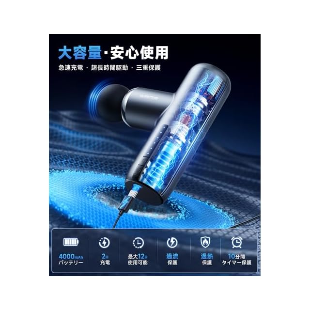 【長時間使用可能なバッテリー&安全設計】4000mAh大容量バッテリーを搭載し、Type-C充電で約2時間の充電で最大12時間の連続使用が可能(実際の使用時間は残量・環境・強度設定により変動)。過熱・過電流・短絡を防止する「Smart Protectシステム」を採用し、10分間の連続使用後は自動で電源がオフになります。