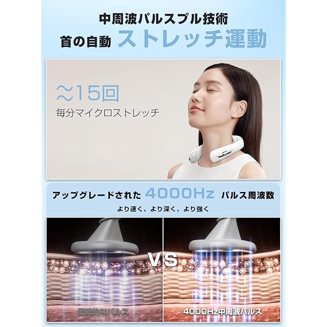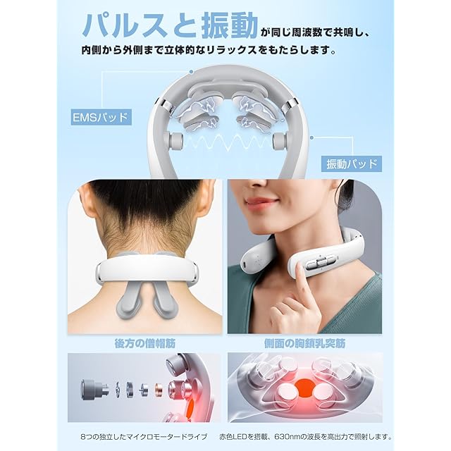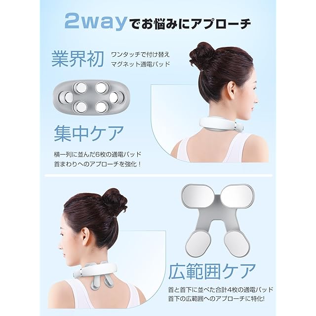 【広範囲を刺激】既製品に比べてもっと強く、気持ちいい“両側振動パッド”を搭載。従来品は襟足のみのケアでしたが、このリラクゼーション器のケア範囲は首の首の両側まで広がります。 さらに驚くべきことに、集中ケアパッドと広範囲ケアパッドの両方を備え、1台のliaoleeネックリラックス器は従来の2台のリラックス器の機能に相当する。