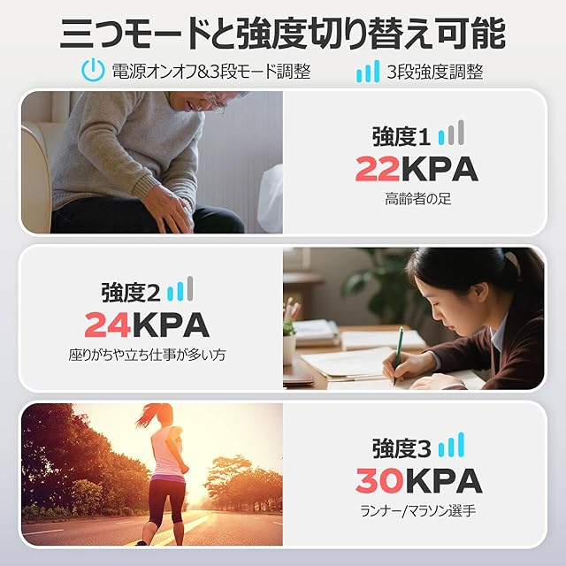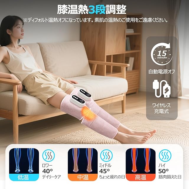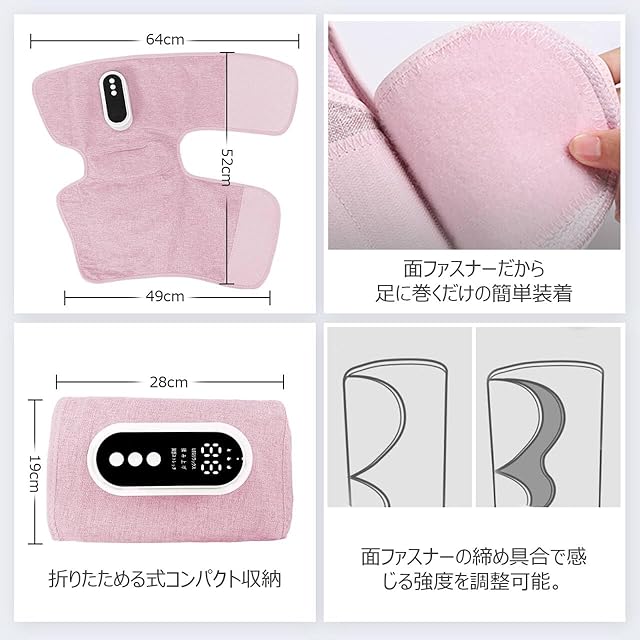【膝温め・15分タイマー】ひざ、ふくらはぎ、太ももと3ヶ所に使え、3種類のモードと強度が調節できます。面ファスナーの締め具合で簡単に調整できるデザイン。膝だけ3段階温感調整機能があり、寒い季節でもぴったりの心地よく温かく、快適に使用できます。夏の暑い時期には、膝温度をオフにすることもできます。その日の気分に合わせてお好みの温度を選んでください。15分で自動停止タイマーにより、過度な使用を防ぎ、ペンが紙に書いているような優しい作動音で就寝中もあんしんにご使用いただけます。