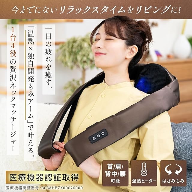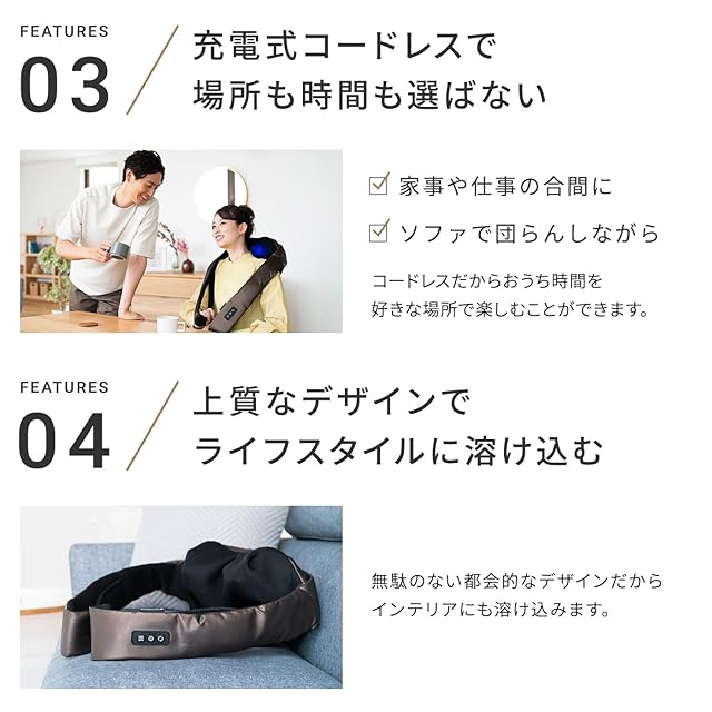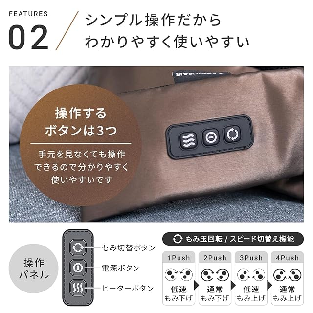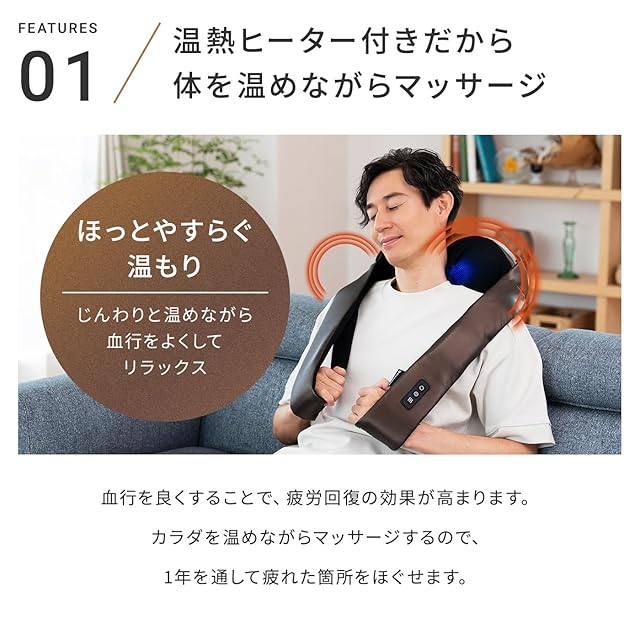 【からだを温めるから、より心地いい。】温熱ヒーター付きでからだを温めながらマッサージ、疲れたからだがほぐれます。もみかえしを防ぐ自動OFF機能付き。約10分で電源が自動OFFになり、つけっぱなしを防いで安全に使用できます。※治療器としての温熱効果はありません。