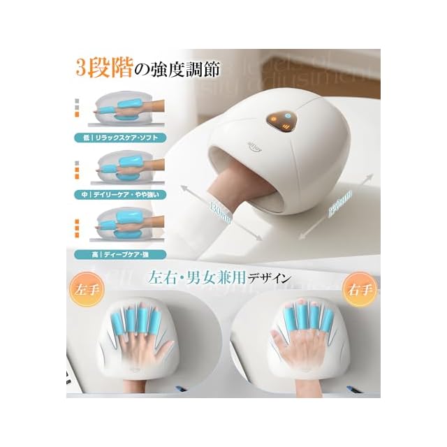 【2種類の揉み方+3段階の強度調整】ALLJOYハンドケアグッズは2種類の揉み方で手のひら、指先を丁寧に揉みこみ、さらに、ハンドケアのエアバッグは3段階の強度調整が可能で、自分の好みに合ったリラックス体験が簡単に見つけられます。左右どちらの手にも対応し、どんな手のサイズにもフィットしやすい設計です。忙しい日常の中で手を頻繁に使う方に特にオススメで、作業後の手を優しくケアします。LEDインジケーターで現在の設定が一目で確認でき、暗い場所でも簡単に操作できます。※初回は最も優しい設定からお試しください。
