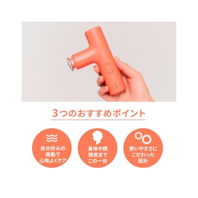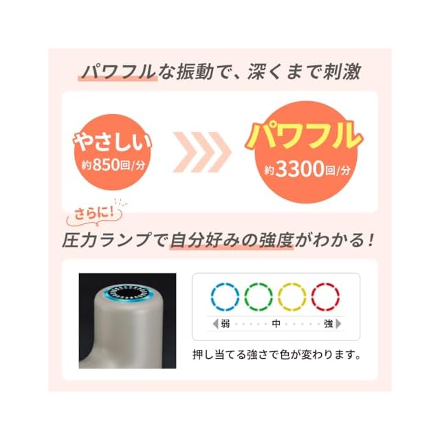 【使いやすさにこだわった設計】 ・片手での操作もらくらく。 ・約240gの軽さと本体側面の「スライドスイッチ」により、片手での操作も簡単。 ・最長8時間の長持ちバッテリー ・Type-Cケーブルで充電も手軽に。 ・控えめな動作音。 ・夜や外出先でも時間や周りを気にせず使えます。 ・圧力ランプで強度をお知らせ。 ・押し当てる強度でランプの色が変わるので、部位ごとの強さの目安も把握できます。