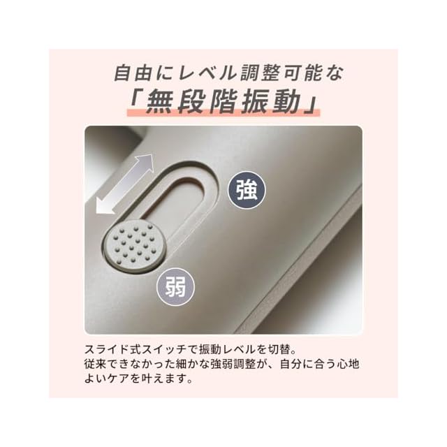 【自分好みの振動で、心地よくケア】 ・パワフルな振動で、深くまで刺激。 ・最大約3,300回/分の振動と7mmの振動幅で筋肉ケア。 ・さらに強く押し当てても止まりにくいので、振動レベルをキープしたまま、ボディケアが行えます。 ・無段階振動で強弱の調整が自由自在。 ・振動が強すぎると刺激が強く感じたり、逆に弱すぎると物足りなく感じることも。 ・無段階で振動回数の切り替えができることで、従来のレベル別の強弱調整では行えなかった細かい振動の調整が可能に。