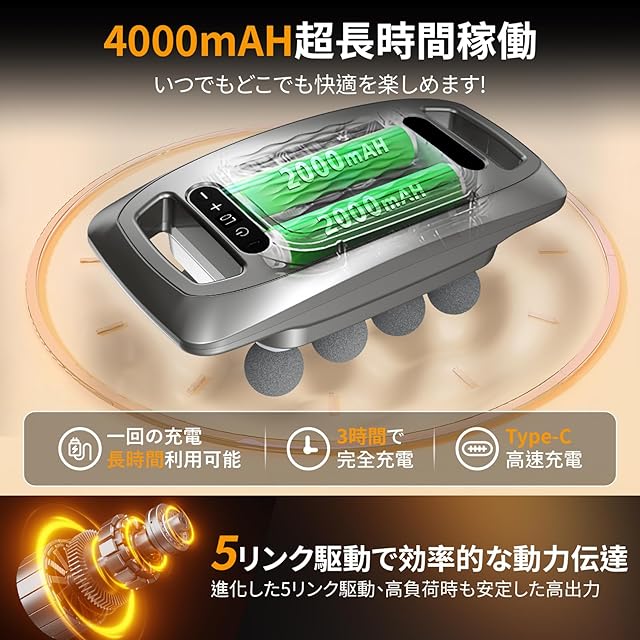 【4000mAh 長時間稼働】筋膜ガンは 4000mAh 大容量バッテリーを搭載し、1 回の充電で長時間時間連続使用することが可能です。Type-C 高速充電に対応しているため、スマホ充電器と同じケーブルで簡単に充電できます。5 リンク駆動技術により、高負荷で使用した場合でも安定した出力を維持できます。「長時間稼働+高効率動力」の特長を活かし、いつでもどこでも快適な使用体験をサポートします。
