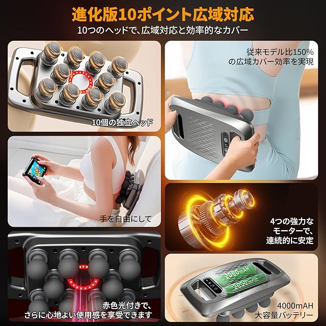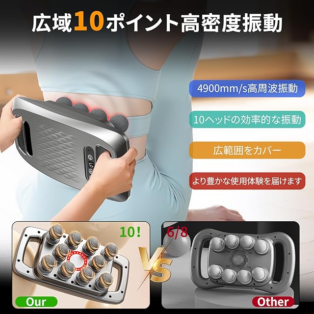 【1 台で広範囲に対応する「10 ヘッド筋膜リリースガン」】今回の筋膜リリースガンは、従来の単発ヘッドの概念を覆す業界初の 10 ヘッド設計を採用しています。ソファでスマホゲームを楽しみながらも、10 点の振動ポイントが同時に作用するため、手を使うことなく自然に使用できます。スマホを使用する時間と併せて活用できる、全く新しい使用スタイルを提供します。この筋膜リリースガンの 10 ヘッドによる広域カバーは、他製品にはない独自の使用感を実現し、広範囲に振動を均一に伝えます。オフィスでの長時間仕事、リビングでの日常時間など、様々なシーンで「手放しで便利に使える」本格的な使用体験をお届けします。