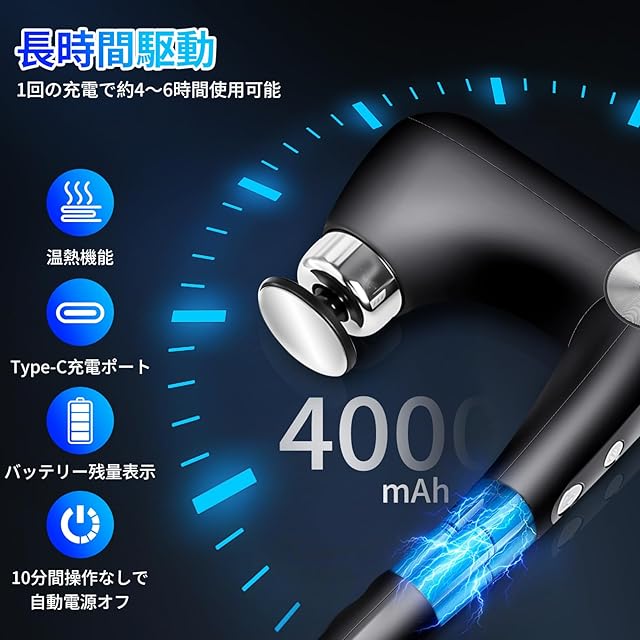 【4000mAh大容量バッテリー&超長時間スタンバイ】当社筋膜リリースガンは、わずか1.5~2時間の充電でフル充電が可能。便利なUSB Type-C充電ポートを採用し、満充電後は最長4~6時間の連続使用を実現します。重量はたったの0.68kgと軽量で携帯性に優れ、外出時にも最適。フィットネス愛好者への心のこもった贈り物としてもぴったりです。