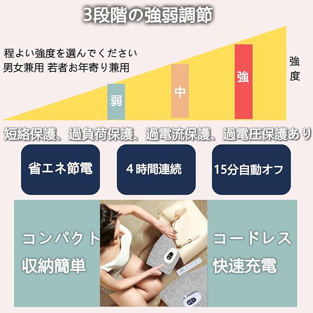 【三つ段階強度】圧の強さも弱、中、強の3つのレベルから選択できます。弱35kpa、中40kpa、強45kpaお好みの最適な圧力を選んでください。モードと強度と組み合わせて、最適なひとつを見つけてください。