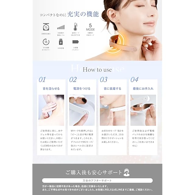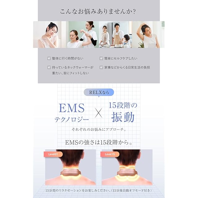✅【最新の2つのテクノロジーを採用】EMSが首にアプローチ!その日の気分に合わせて15段階の強弱レベルが選択可能。さらに温熱テクノロジーの搭載で30秒以内で徐々に快適な温度へ、RELX(リラクス) ネックウォーマーは至極のリラクゼーションをお届けします。(初めてご使用になる場合はレベル1からご使用頂き徐々にご自身にあったレベルをお選びください。)