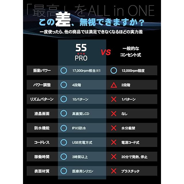 最高性能を目指し開発した55evePRO。 超強力振動、液晶画面搭載、大容量バッテリー、生活防水機能などのこだわりがオールインワン。 使いやすさを多機能を両立させたプロスペック仕様です。