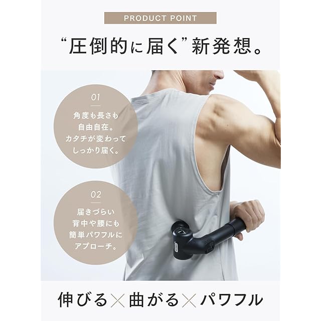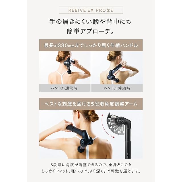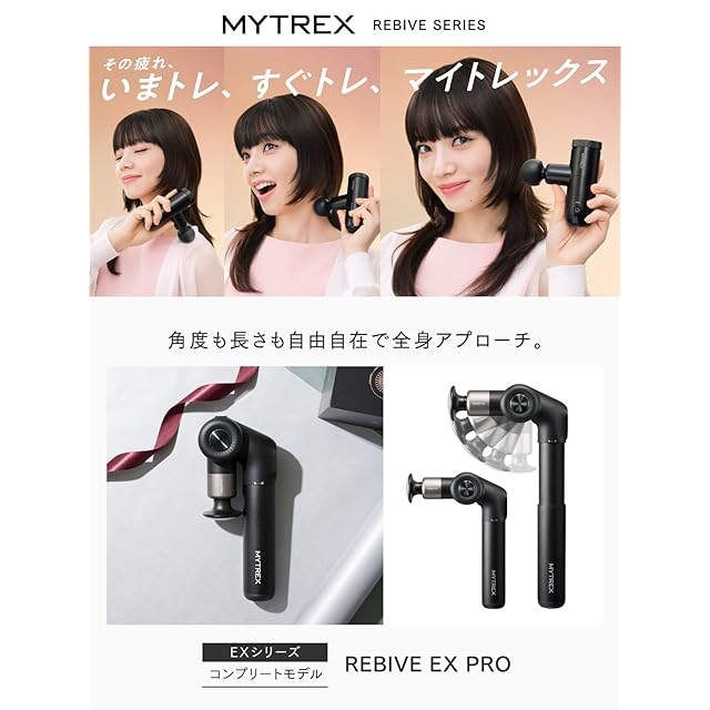 選ばれ続けるプロの『 整体 』<br> 新発想 伸びる×曲がる×パワフル<br> パワフルなだけじゃない<br> “圧倒的に届く”<br> <br><br> [ Point!]<br> 01 角度も長さも自由自在。<br> カタチが変わってしっかり届く。<br> 02 背中も、腰も、手足も。<br> 驚くほどラクに。<br> 全身にベストアプローチ。<br> <br><br> ●ブランド名 : MYTREX(マイトレックス)<br> ●販売名 : REBIVE EX PRO (リバイブ イーエックスプロ)<br> ●品番 : MT-RBEX23B<br> ●本体寸法 : 約239mm×98mm×81mm(本体折りたたみ時)<br> 約330mm×148mm×81mm(アーム角度90°・ハンドル最長時)<br> ●重量 : 約690g(本体のみ、アタッチメントは含まず)<br> ●素材 : 本体:PC-GF20、ABS樹脂、アルミニウム合金、アクリル、ステンレス、シリコンアタッチメント:ABS樹脂、シリコン、(温熱アタッチメントのみ次を含む:アルミニウム)<br> ●振動機能 : 約1200回~3200回/分<br> ●電気持続時間 : 最長 約8.5時間(低速・温熱機能オフ時)<br> 最短 約2時間(高速・温熱機能オン時)<br> ●定格時間 : 10分<br> ●使用環境 : 温度 5℃~40℃、相対湿度 ≦85RH%<br> ●パッケージ内容 : 本体×1・充電用USBコード×1・アタッチメント×6種類・取扱説明書×1・備品収納袋×1・アタッチメント用ストッパーゴム(予備)×2<br><br>