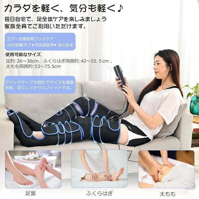 商品名:業界初 フットケア 足先 太もも ふくらはぎ EMS 空気圧 温熱 6モード 3段階強度 3段階温度 足裏 膝ヒーター機能付 レッグリッラクスサー 立ち仕事、運動、家事後 家庭用 男女兼用 敬老の日 母の日 父の日 収納袋付