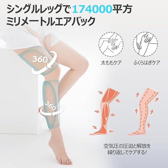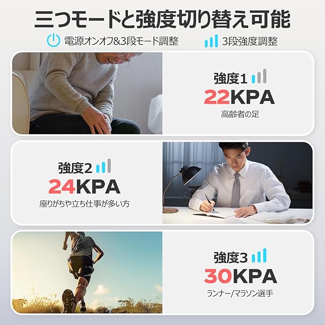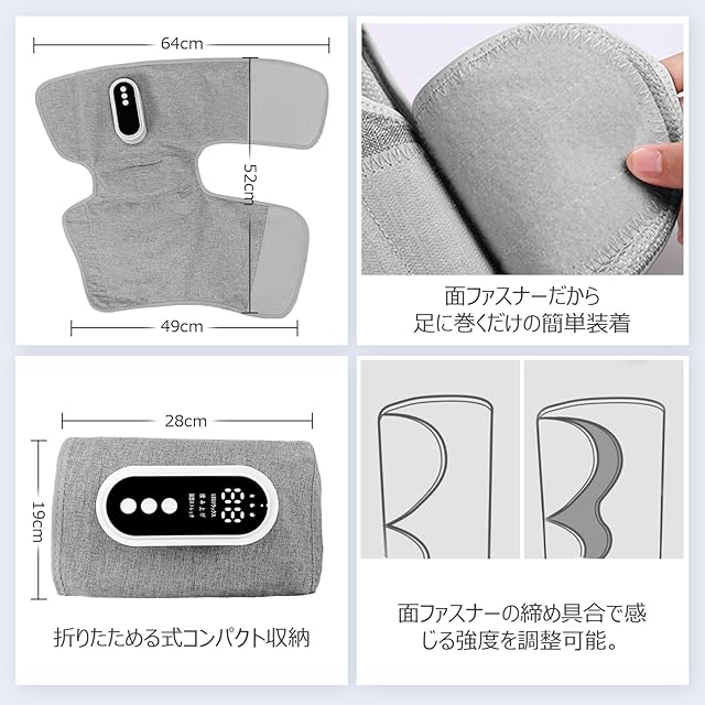 【膝温め・15分タイマー】ひざ、ふくらはぎ、太ももと3ヶ所に設置されたエアバッグが脚全体をギューっと包み込んで締め付け3種類のモードと強度が調節できます。締め付けが強すぎるのが苦手のも、面ファスナーの締め具合で簡単に調整できるふくらはぎリラクゼーションデザイン。膝だけ3段階温感(低温(40°)・中温(45°)・高温(50°))と温度調整機能があり、寒い季節でも冷え性にぴったりの心地よく温かく、快適にフットリフレッシュができます。夏の暑い時期には、膝温度をオフにすることもできます。その日の気分に合わせてお好みの温度をえらんでください。15分で自動停止タイマーにより、過度な使用を防ぎ、ペンが紙に書いているような優しい作動音で就寝中もあんしんにふくらはぎ ケアご使用いただけます。※ご注意:素肌で膝温めを利用するのをご遠慮ください。個人体質によって熱が高めでケガをする恐れがあります。