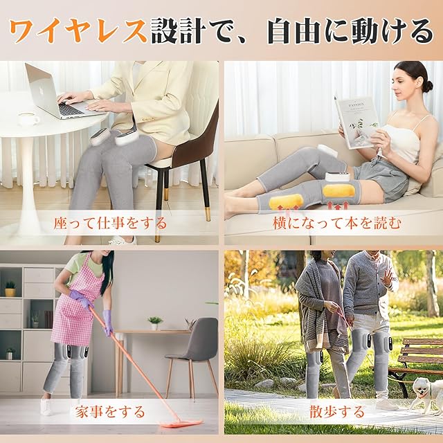 【充電式・コードレスデザイン】最大2時間連続作動可能の2000mAhの大容量長持ちバッテリーが内蔵。コードレス ふくらはぎの為、コンセントの近くにいる必要がなく場所を選ばずに使える。仕事中やテレビを見ながらでもどこでもリラックスできます。立ち仕事や座り仕事、横になっている時も場所を移動しても外さなくてもどんな姿勢でも使いやすいデザイン。装着したまま家事やトイレも可能なので実にコードレスがストレスフリーです。