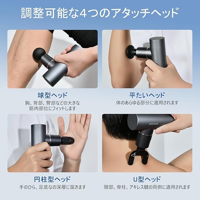 【調整可能な4つのヘッド&静かな動作音45dB】球形、U形、円柱形、平形のアタッチメントに交換可能。リラックスした状態で自然な姿勢でご使用いただけます。環境に優しい高品質のシリコン素材で作られたヘッドは、表面が柔らかく、使い心地が良いです。4つのヘッドとも防水性があり、汗や汚れを気にせず使用できます。高トルクブラシレスモータを搭載し、ノイズを効果的に制御します。最大3200rpm/minで、作動音は45dB(日常会話程度)未満の非常に低騒音。深夜に使用しても周囲の人の邪魔にならず、いつでもどこでも使用を楽しめます。