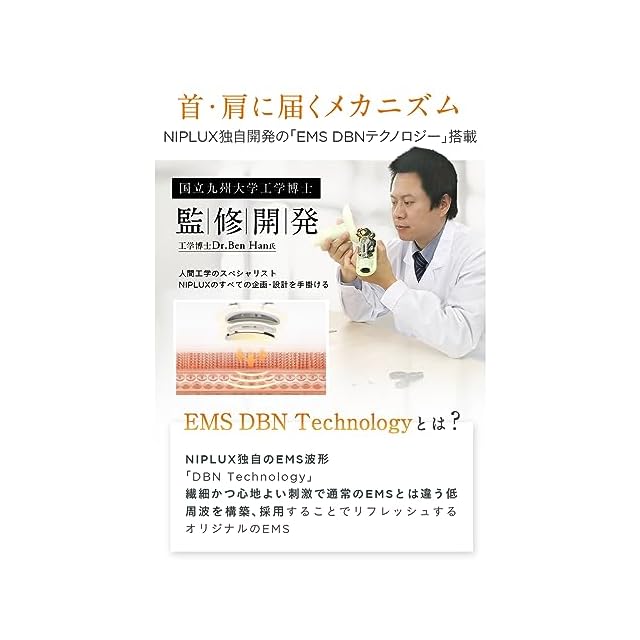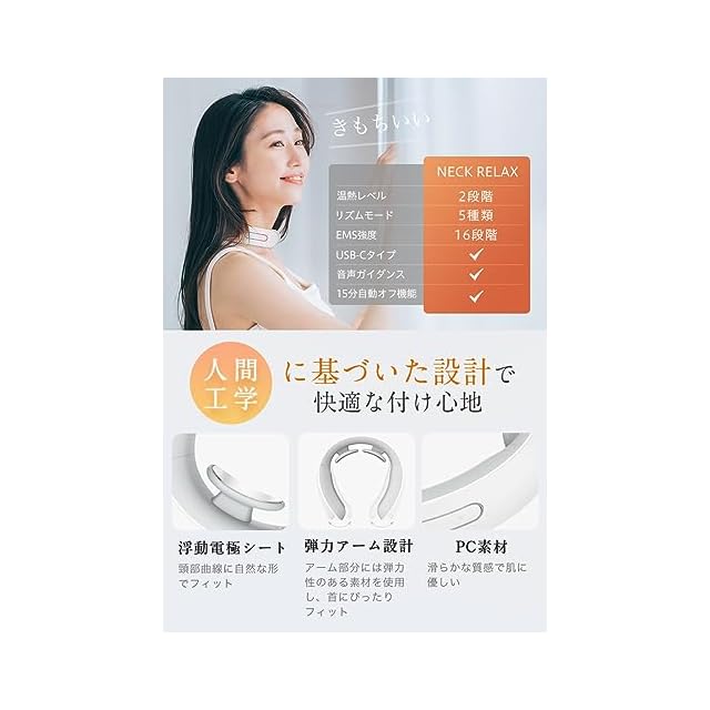 【首にフィットする着け心地】 2枚の電極パッドと柔軟性のあるフレーム設計で、首にピッタリフィットします。 お肌に優しい材質で、心地よい装着感です。