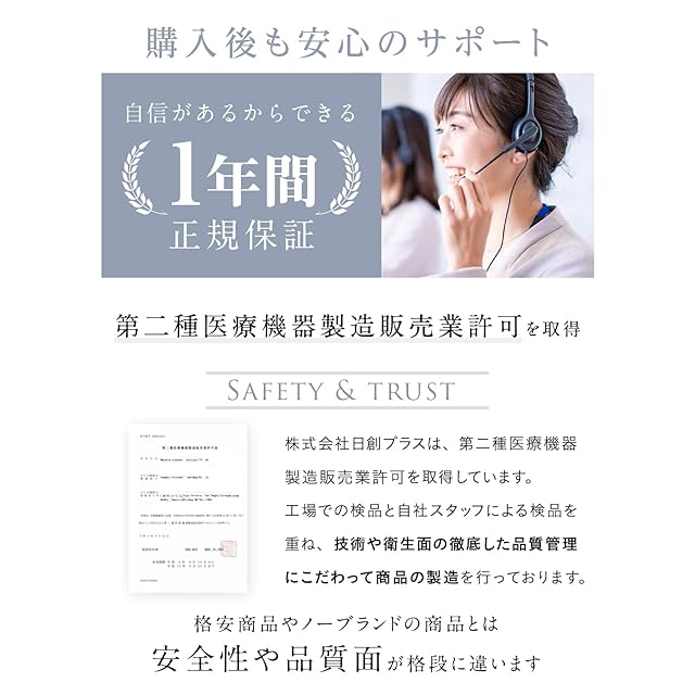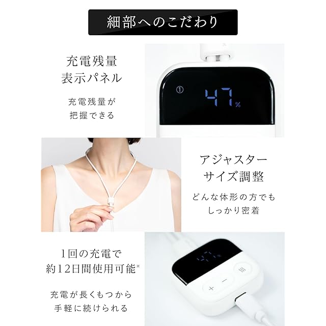 【使いやすい機能設計】① 充電残量を確認できる表示パネル付き。② アジャスターでサイズ調整が可能。③ 1回の充電で約12日間使用可能(※1日1回約15分使用した場合)。④ 丸めてコンパクトに収納できる軽量設計(約57g)で、持ち運びも簡単。